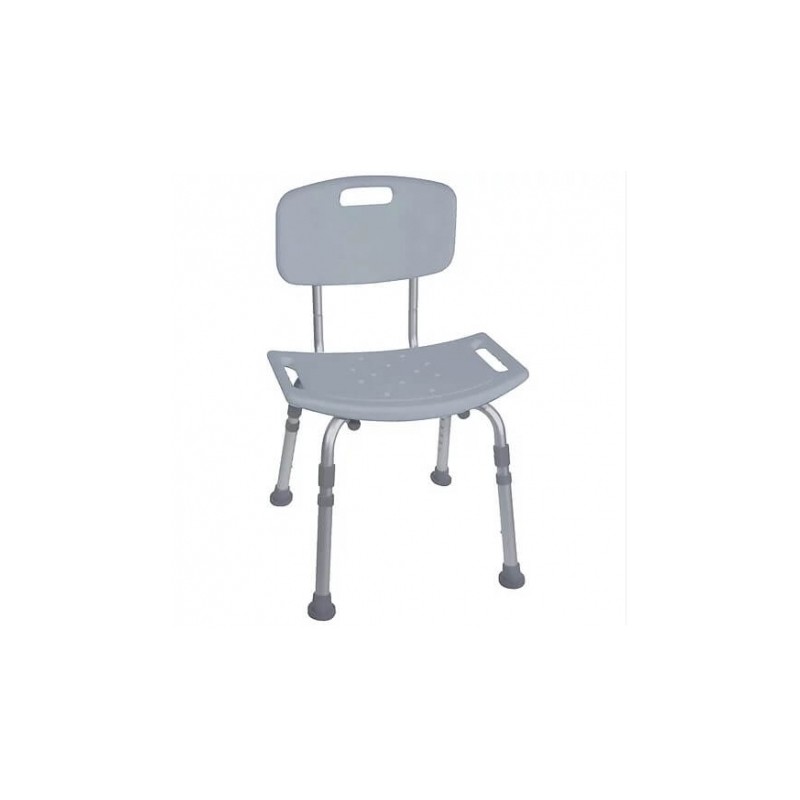 Silla para baño con respaldo color gris Características: • Estructura de aluminio, completamente  desarmable. • Respaldo y asiento de plástico en color gris. • Asiento contorneado de alta densidad, con orificios para el rápido drenado. • Altura ajustable a 8 niveles. • 4 regatones antiderrapantes. • Soporta 110 kg. Origen: Inglaterra
