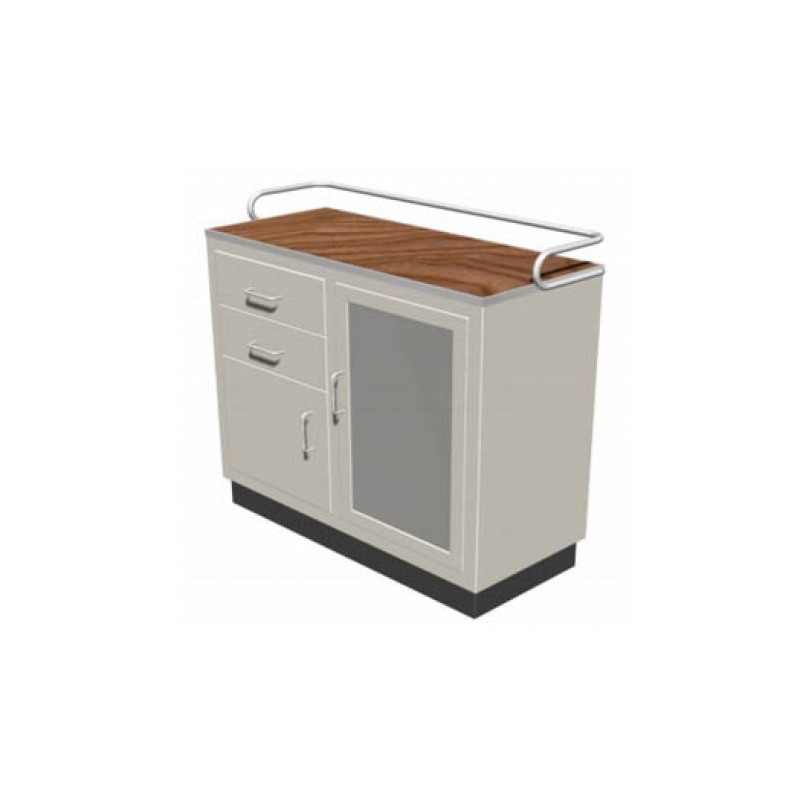 Gabinete doble esmaltado. Características: Barandal en solera de aluminio de 3.1mm. (1/8") de espesor, acabado pulido. Cubierta en lámina de acero calibre No. 22, acabado en laminado plástico imitación madera, con moldura perimetral de aluminio. Estructura, cajones y puerta izquierda en lámina de acero calibre No. 22, acabado en esmalte horneado. Puerta abatible derecha en lámina de acero, calibre No. 22, con ventana de vidrio de mm. (1/8") de espesor, acabado en esmalte horneado. Cerradura integrada. Jaladeras metálicas tipo puente cromadas. Garantia: 2 años contra defectos de fabricaciónOrigen: México